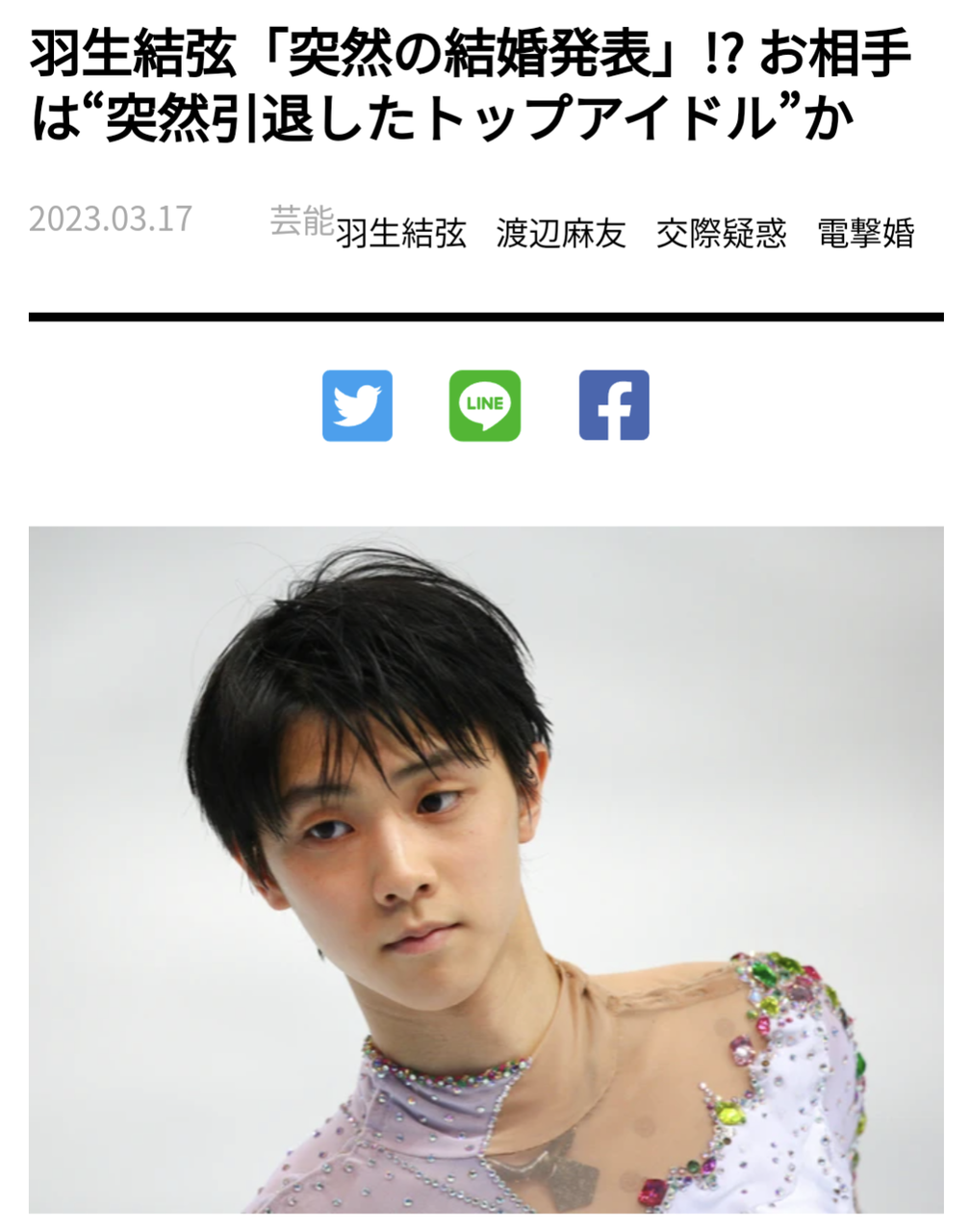 「結婚相手については明らかになっておらず、ネット上ではさまざまな憶測が飛び交っています。エンゼルスの大谷翔平に負けず劣らず、羽生も熱烈な女性ファンが多いですから、これまでに複数人との恋愛ゴシップが流れました。とはいえ、特定の相手との?交際確定報道?はほとんどありませんでした」(芸能ライター)